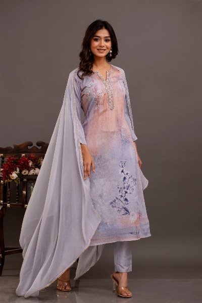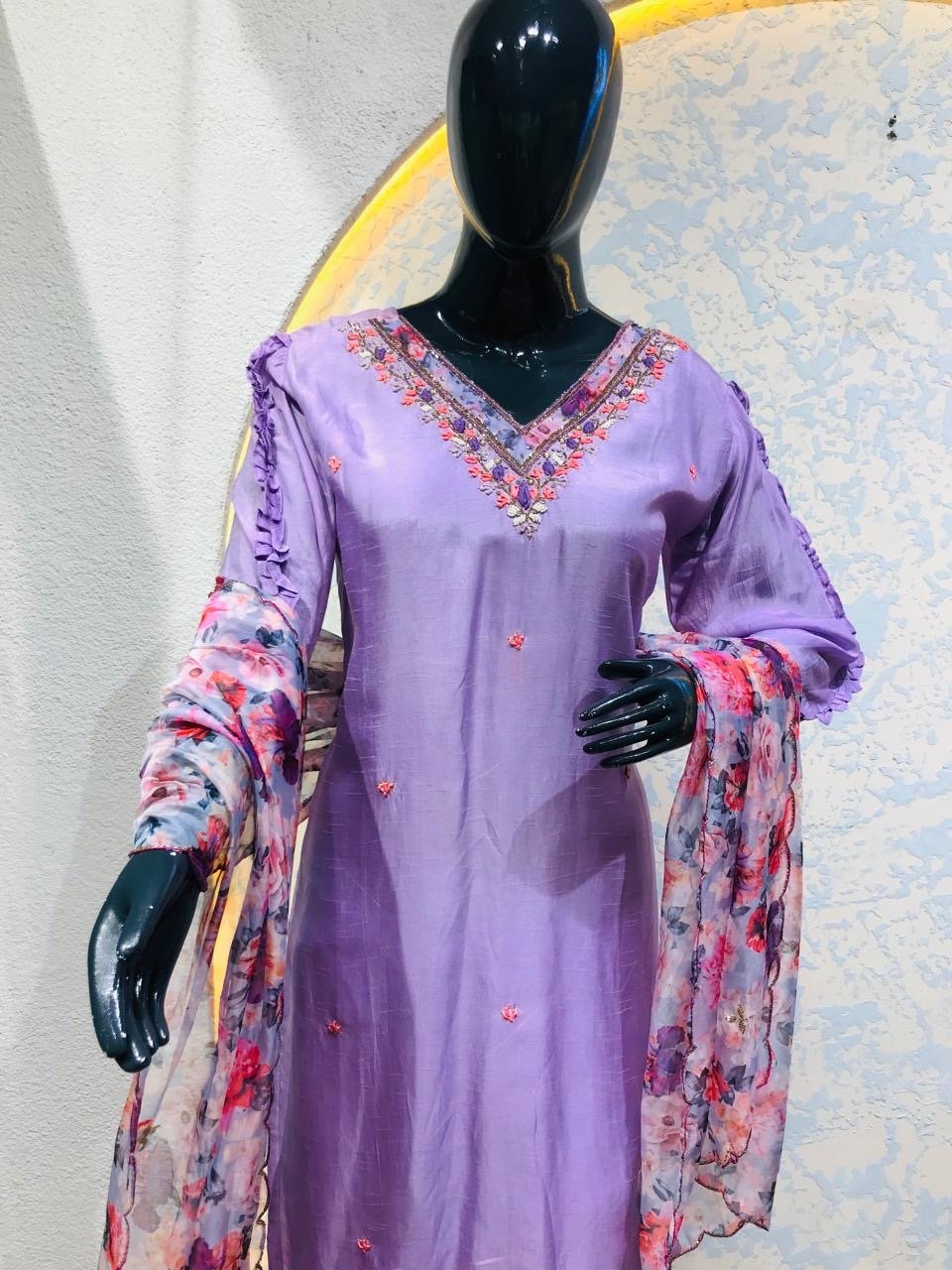 Straight pattern ,v neck thread,embellished/moti , designer sleeves ,floral print embellished /cut work on dupatta