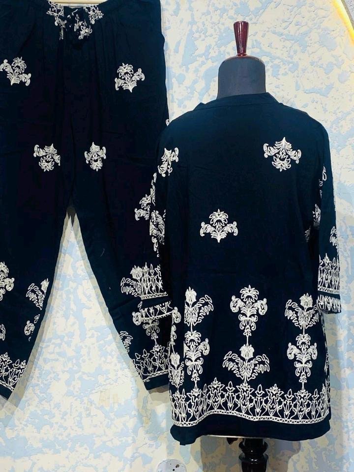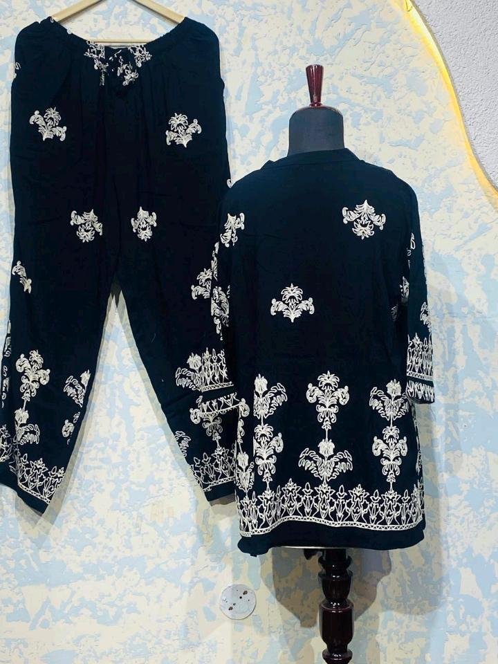 Elevate your everyday style with this sophisticated and comfortable Black Thread Work Co-ord Set. Crafted from premium, breathable fabric, this ensemble features intricate white ethnic embroidery that pops beautifully against the deep black base. Designed specifically in a 5XL size, it offers a relaxed yet flattering silhouette perfect for casual outings, office wear, or festive gatherings.