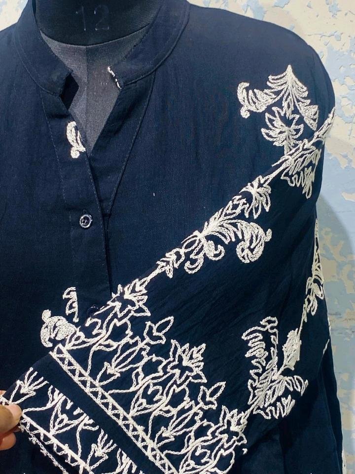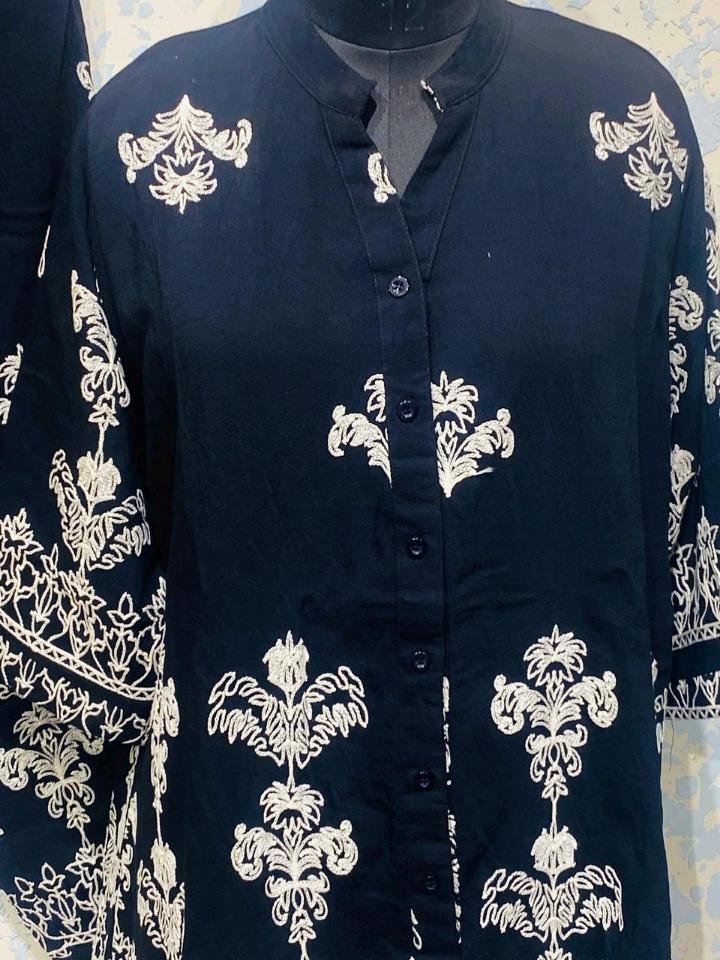 Flattering Cut: The long tunic-style top features a classic mandarin collar and button-down front, paired with matching embroidered trousers.