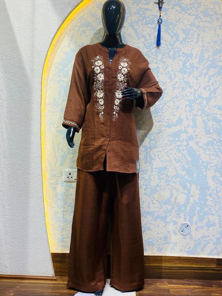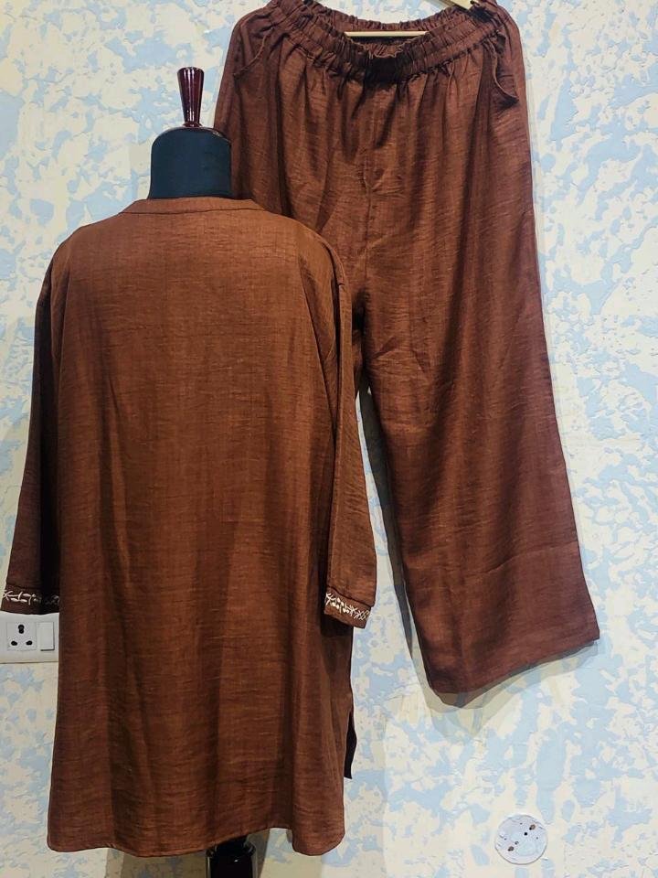 Elevate your daily wardrobe with this sophisticated and comfortable 2-piece cord suit. Crafted in a rich, earthy brown tone, this set perfectly blends traditional elegance with a contemporary silhouette.