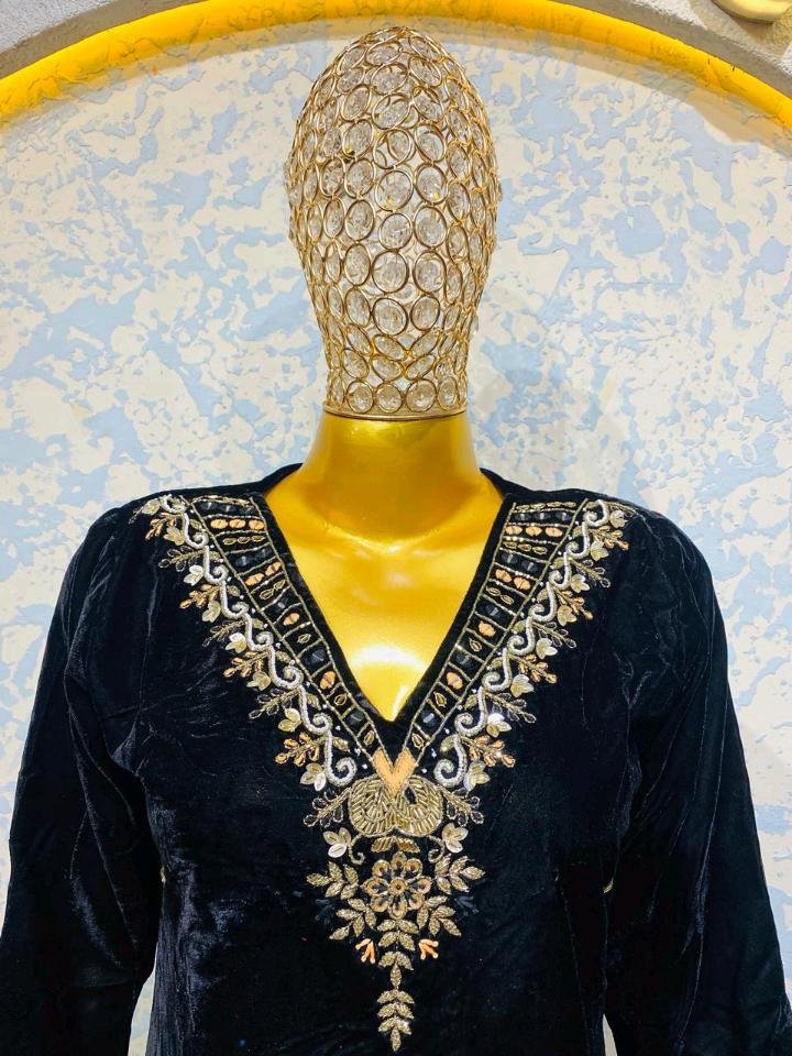 • Bottoms: Matching velvet trousers with delicate embroidery highlights.