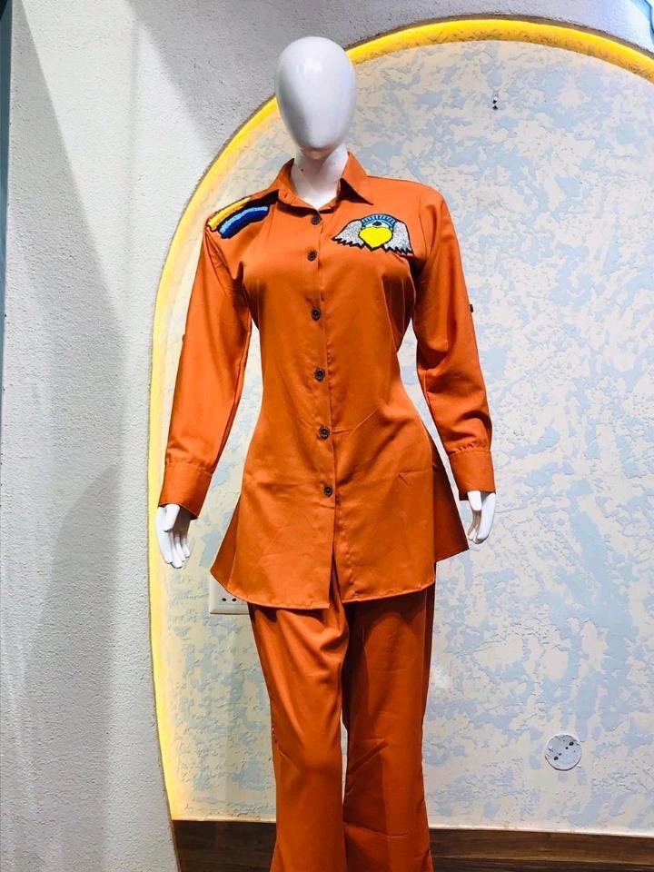 Elegant Silhouette: The longline, button-down tunic shirt offers a flattering, structured fit, paired with matching wide-leg trousers for a cohesive, elongated look.