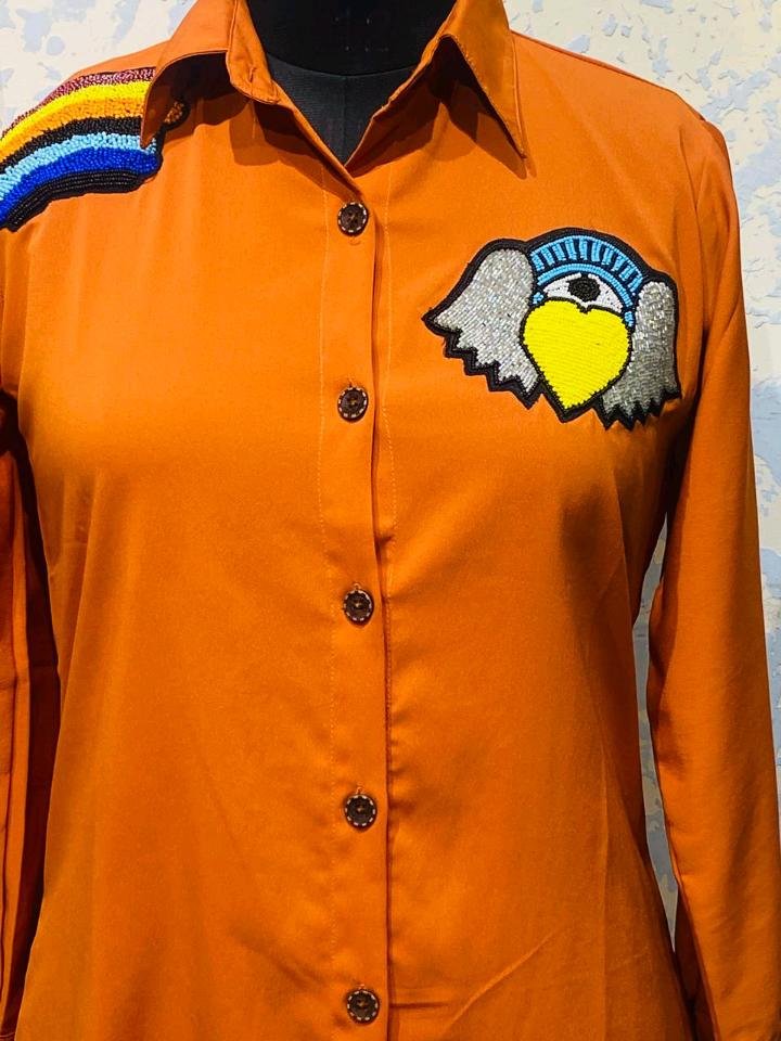 Unique Artistry: Features intricate, handcrafted beadwork patches, including a striking shoulder “rainbow” motif and a whimsical heart-with-wings chest emblem.