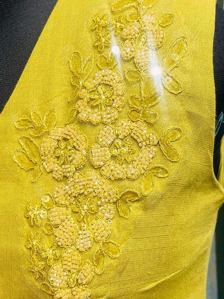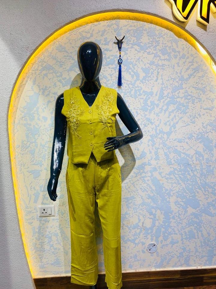 The set features a sleeveless, button-down waistcoat adorned with intricate, tonal floral embroidery and delicate beadwork that catches the light beautifully. Paired with relaxed-fit trousers featuring an elasticated waistband for all-day comfort, this set is designed for the woman who loves effortless elegance.