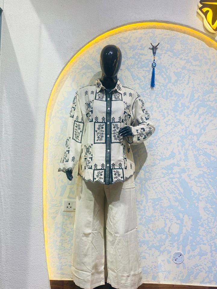 Embroidered Linen-Blend 3-Piece Co-ord Set in Ivory