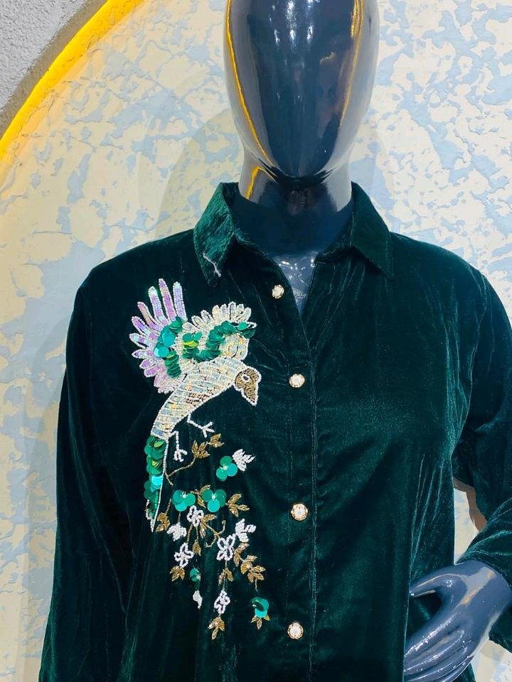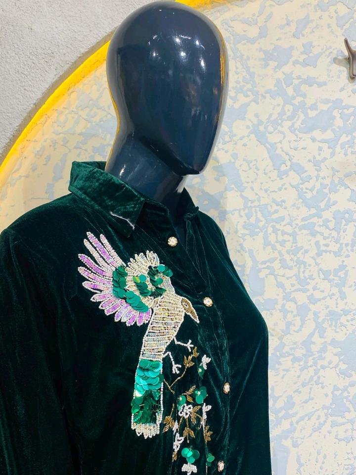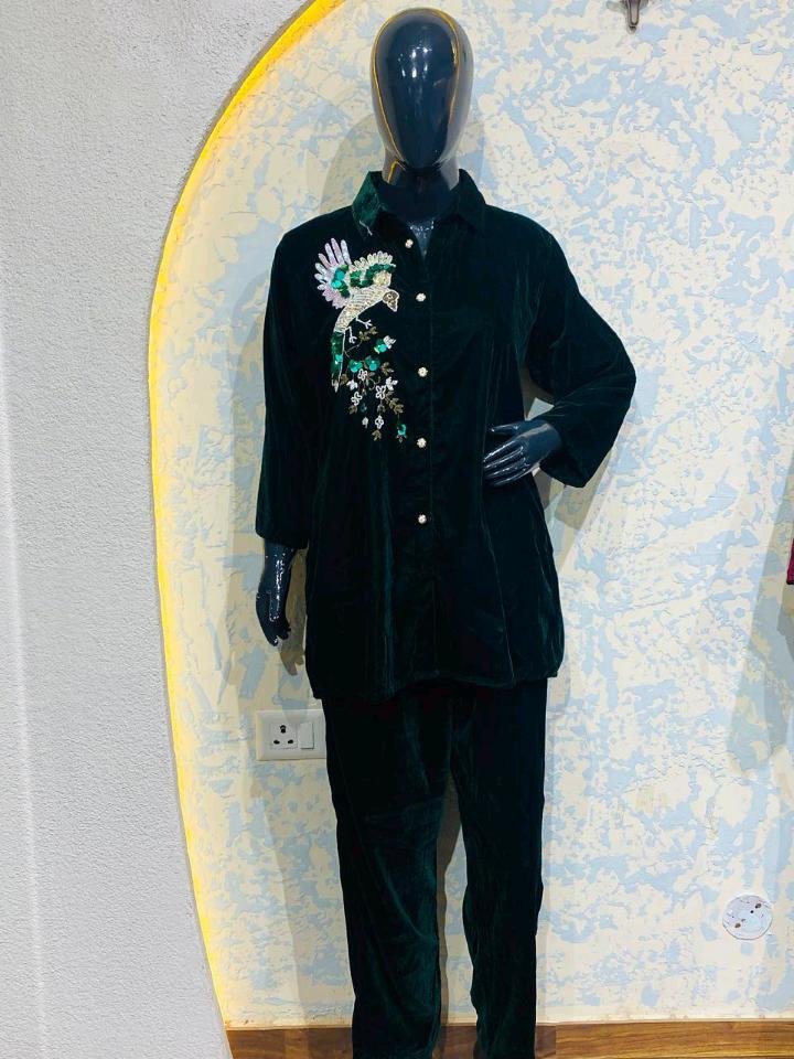Elevate your winter wardrobe with this stunning Green Heavy Cord Suit, where luxury meets intricate craftsmanship. Made from premium heavy velvet corduroy, this co-ord set features a rich emerald hue and a spectacular hand-embroidered bird motif adorned with shimmering sequins and beadwork.