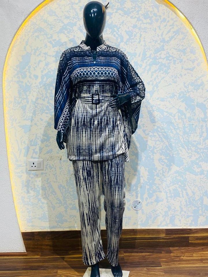 Make a bold style statement with our Indigo Shibori Print Cord Set. This two-piece ensemble features a contemporary kaftan-style tunic with flowing sleeves and a notched neckline, cinched at the waist with a matching fabric belt for a flattering silhouette.