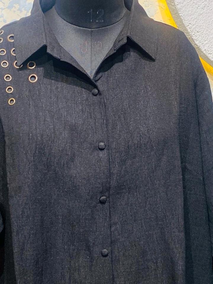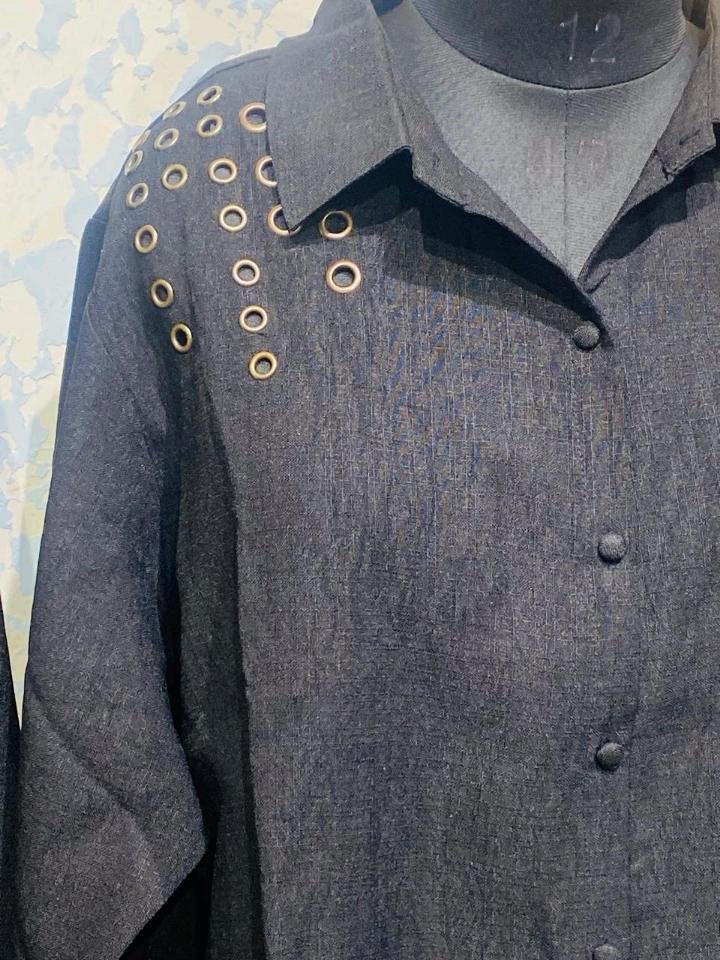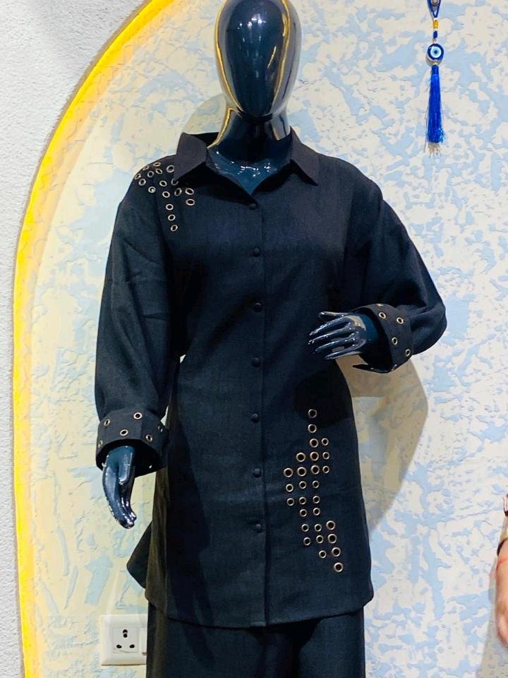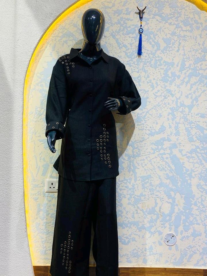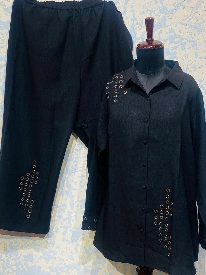 Crafted from a premium, breathable dark-wash fabric with a subtle linen-like texture, this set is perfect for all-day wear. The long-line tunic shirt features a classic collar and button-down front, elevated by striking gold-toned eyelet embellishments on the shoulder and hem. The matching wide-leg trousers echo the design with eyelet detailing at the cuff, ensuring a cohesive, high-fashion look from head to toe.