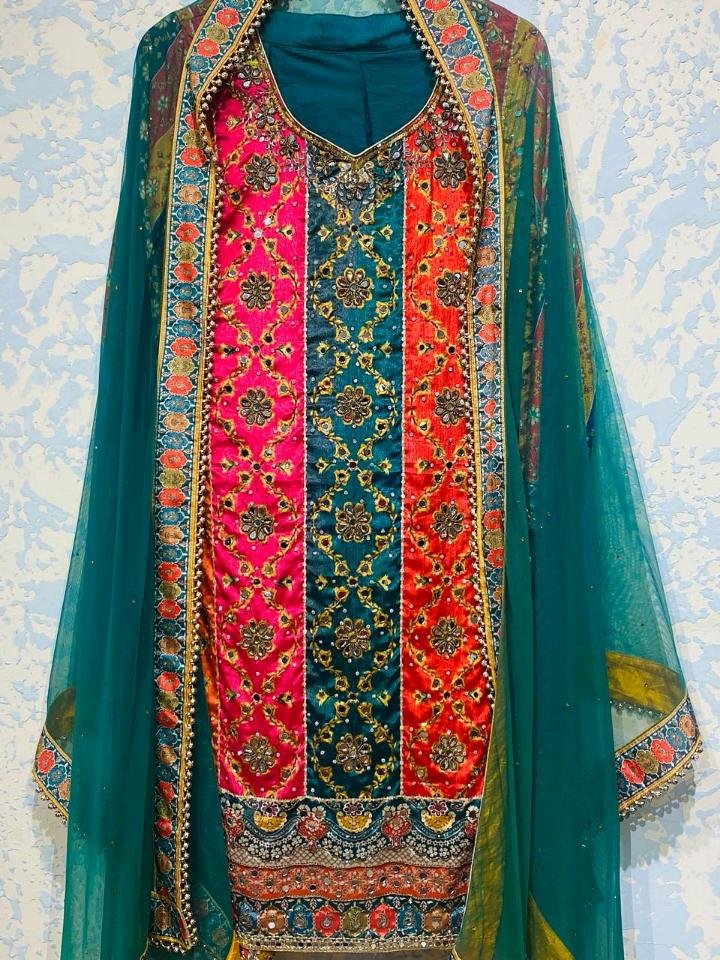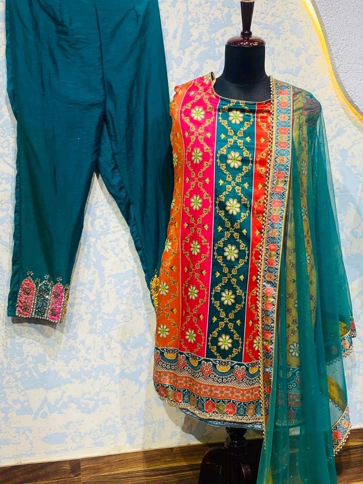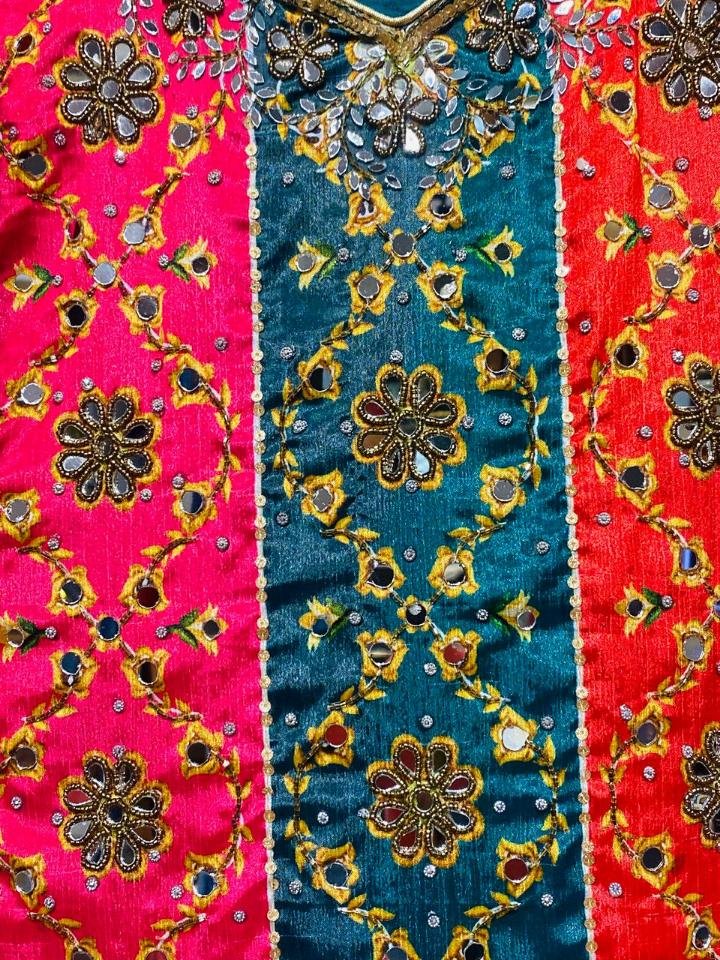 Elevate your festive wardrobe with this stunning 3-piece ethnic ensemble. Designed for those who love a vibrant, traditional aesthetic, this suit features intricate handcrafted mirror work (Sheesha) and rich silk-finish fabrics. The bold vertical panels of Rani pink, teal, and orange create a slimming, regal silhouette perfect for weddings, parties, or festive celebrations.