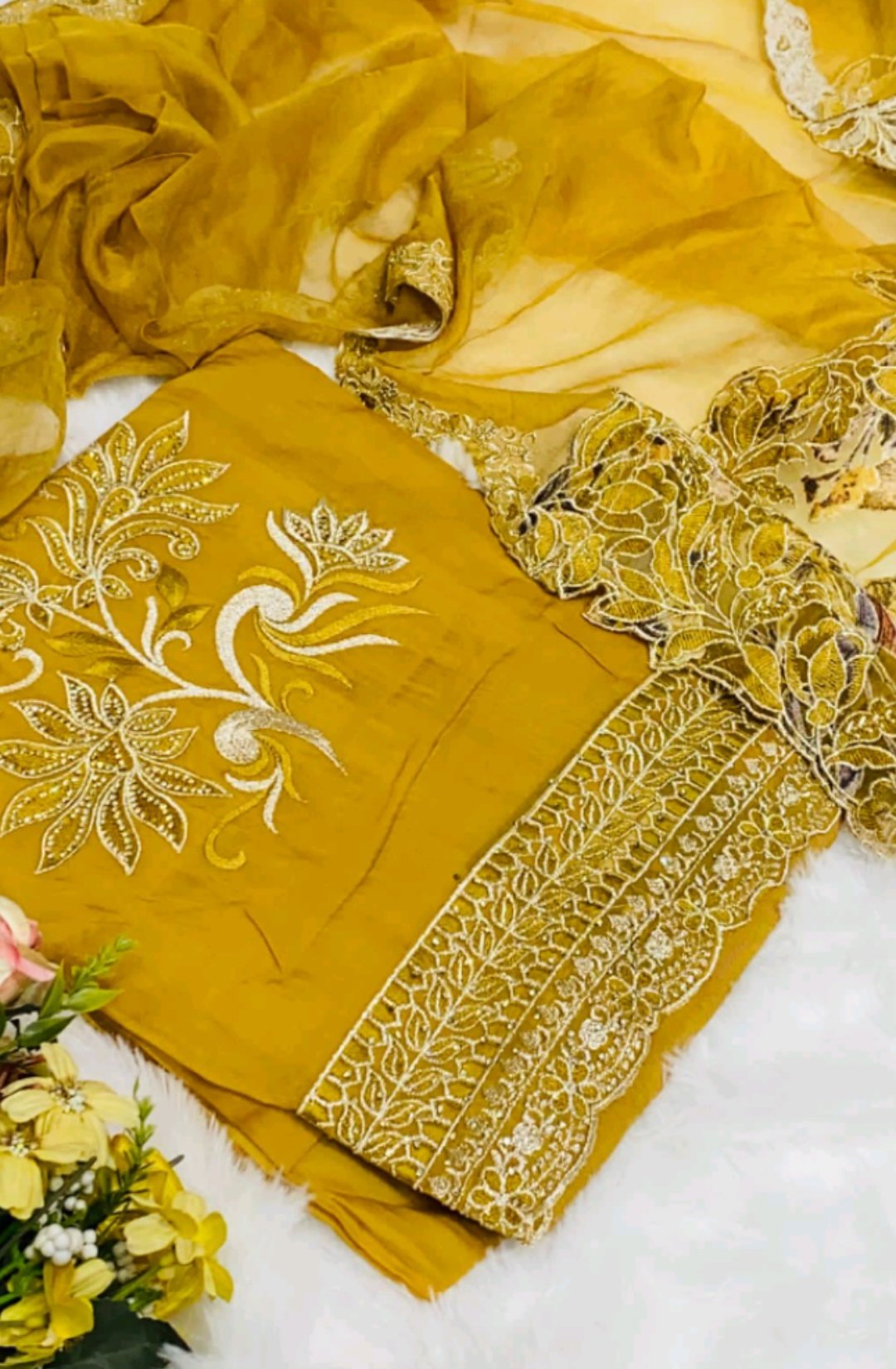 Step into timeless elegance with this Organza Heavy Suit, designed for women who love rich textures and intricate detailing. Crafted in premium organza fabric, this unstitched suit set features luxurious embroidery that instantly elevates your festive and occasion wear look.