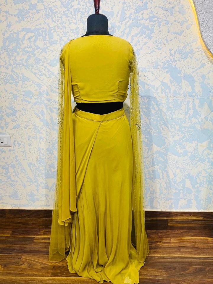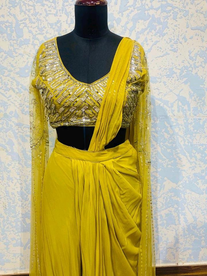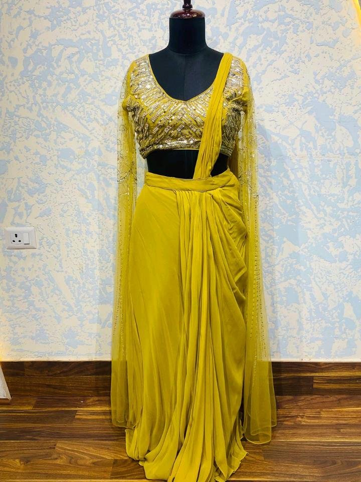 Make a striking statement at your next celebration with this elegant Mustard Yellow Indo-Western Drape Saree. Designed for the modern woman who values both tradition and ease, this pre-stitched ensemble offers a seamless silhouette without the hassle of traditional draping.