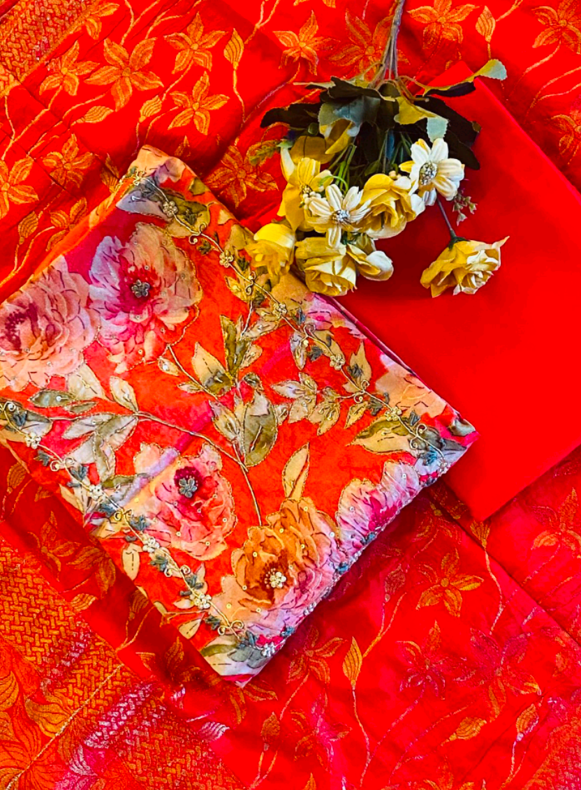 Embrace effortless elegance with this stunning unstitched suit set, crafted from premium, lightweight crepe fabric. Featuring a vibrant, large-motif floral print that blooms across the kurta, this ensemble strikes the perfect balance between modern chic and traditional charm. The buttery-soft texture ensures a flattering drape and all-day comfort, making it an ideal choice for office wear, casual outings, or daytime events. This set includes the printed top fabric, a coordinating solid bottom, and a complementary dupatta, allowing you to customize the fit and style exactly to your preference.