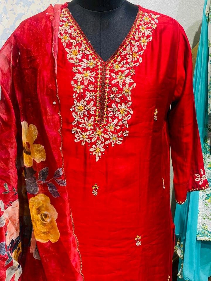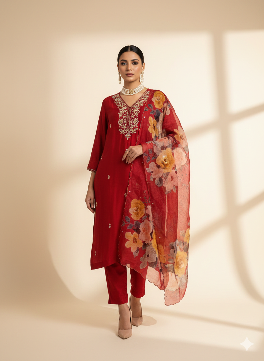 Exquisite Hand-Artistry: The kurta features intricate Zardosi and beadwork detailing. Choose between the regal Deep Teal with multi-colored floral thread accents or the striking Ruby Red with classic golden-ivory floral embroidery around the neckline.