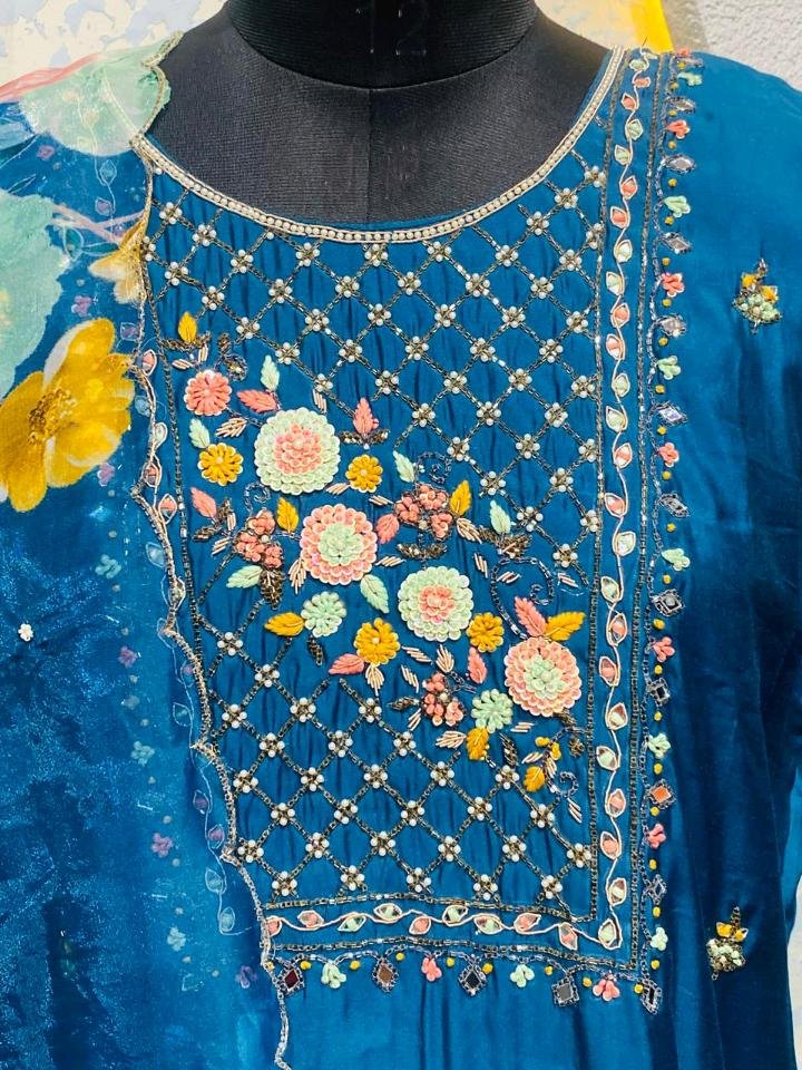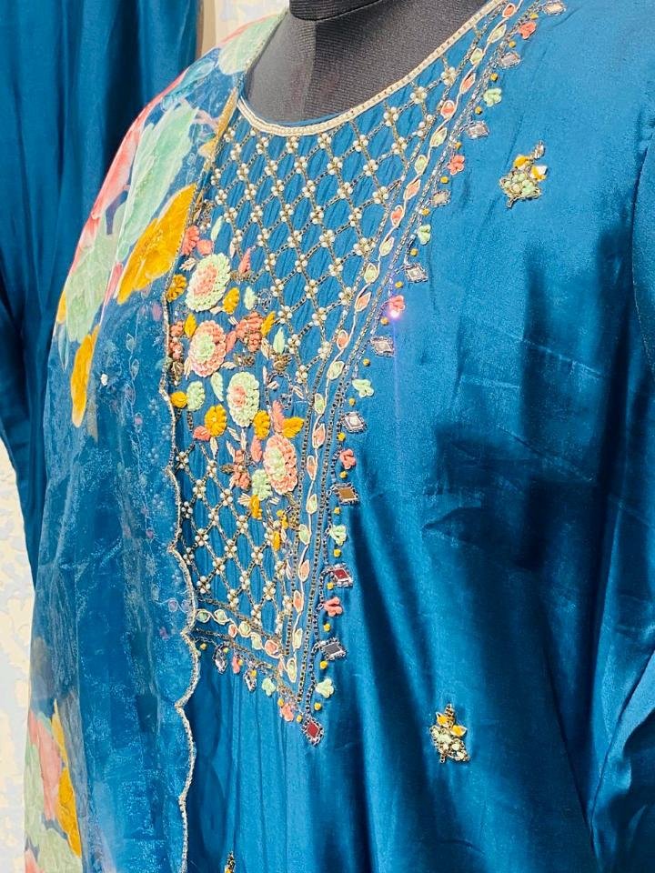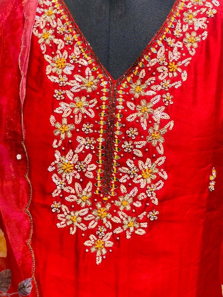 Premium Silk Hand-Embroidered Saloon Suit with Organza Floral Dupatta (Size 4XL)