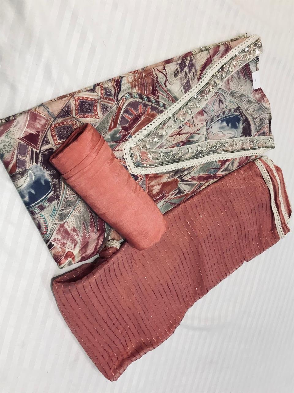 Muslin fabric /v neck /printed suit lace work and chiffon dupatta